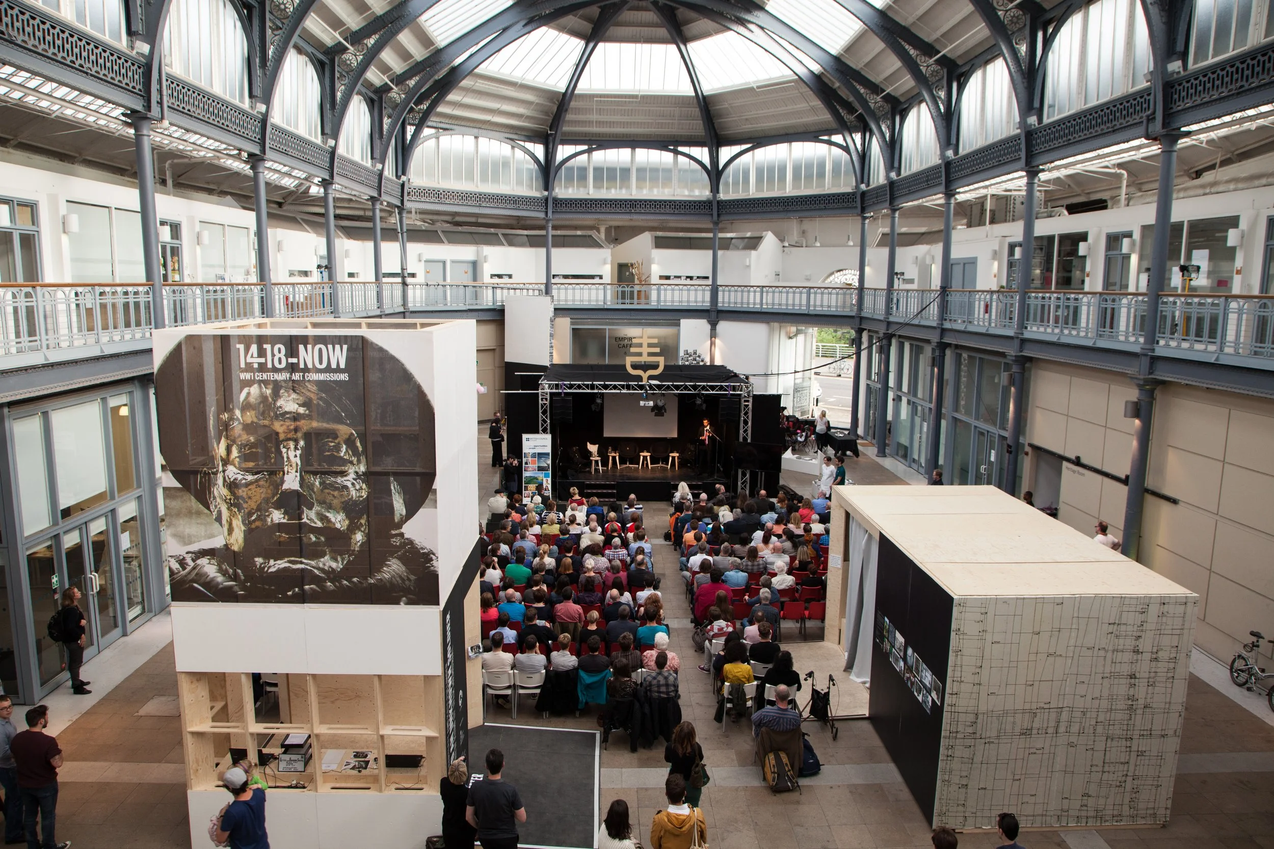 The space was animated during 8-days through the introduction of the cafe space, a temporary main stage for a programme of over 40 events plus a series of bespoke pavilions/spaces for exhibiting work relating to the theme. Whilst the project addressed a challenging - and important - theme, the event attracted 4000 visitors over the course of the week and was in a convivial, welcoming environment.
